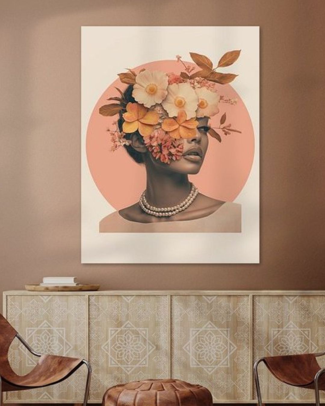Een vrouw met een herfstboeket om haar hoofd, omringd door zachte tinten van peach, warm wit en bruin, straalt kalmte en zelfvertrouwen uit. Het laat de overgang van drukte naar verstilling zien, van zomer naar herfst. Dit werk staat symbool voor de ruimte die ontstaat als je even loslaat.